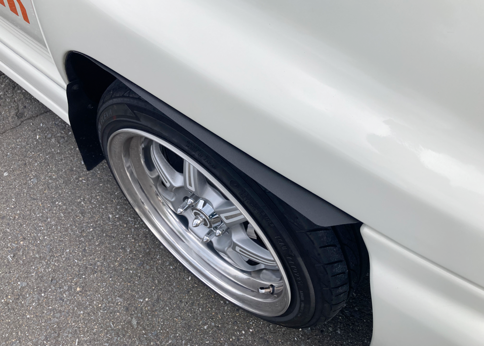 前回通してホイール&タイヤに履き替えてくるかと一旦帰宅する事にして、道中考えたのが、せっかくホイール&タイヤを新調したので、なんとか合法的に使い続けられるようにしたい... そこで閃いたのが、4WD トラックなんかでハイリフトにしてオーバーフェンダーに更に、ペラペラのシートが付いているのを見た覚えがあったので、同様に、オーバーフェンダー的な物をつければいけるのではないかと。